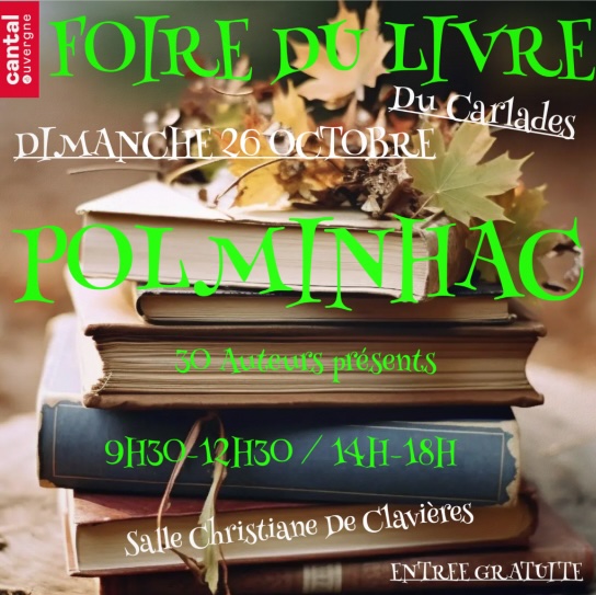 La foire du livre du Carladès, organisé, à Polminhac (Cantal), par la librairie vicoise Au Café des livres et l'association D'Lire, se tiendra dimanche 26 octobre 2025, salle Christiane-de-Clavières, de 9 h 30 à 14 h 30 et de 14 heures à 18 heures.
