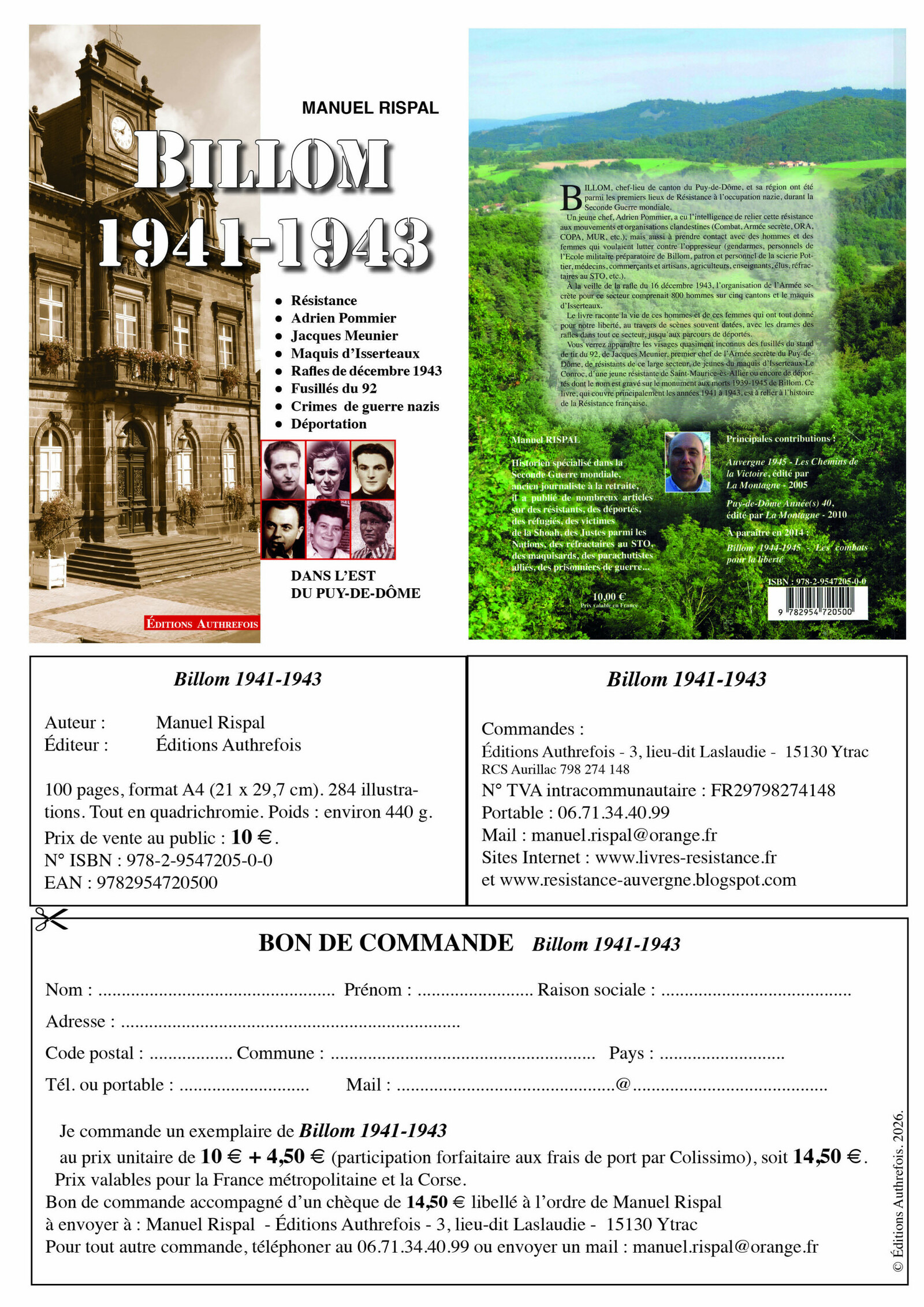 BILLOM, chef-lieu de canton du Puy-de-Dôme, et sa région ont été parmi les premiers lieux de Résistance à l'occupation nazie, durant la Seconde Guerre mondiale. Un jeune chef, Adrien Pommier, a eu l'intelligence de relier cette résistance aux mouvements et organisations clandestines (Combat, Armée secrète, ORA, COPA, MUR, etc.), mais aussi de prendre contact avec des hommes et des femmes qui voulaient lutter contre l'oppresseur (gendarmes, personnels de l'Ecole militaire préparatoire de Billom, patron et personnel de la scierie Pottier, médecins, commerçants et artisans, agriculteurs, enseignants, élus, réfractaires au STO, etc.). A la veille de la rafle du 16 décembre 1943, l'organisation de l'Armée secrète pour ce secteur comprenait 800 hommes sur cinq cantons et le maquis d'Isserteaux. Le livre raconte la vie de ces hommes et de ces femmes qui ont tout donné pour notre liberté, au travers de scènes souvent datées, avec les drames des rafles dans tout ce secteur, jusqu'au parcours des déportés. Vous verrez apparaître les visages quasiment inconnus des fusillés du stand de tir du 92, de Jacques Meunier, premier chef de l'Armée secrète du Puy-de-Dôme, de résistants de ce large secteur, de jeunes du maquis d'Isserteaux-Le Conroc, d'une jeune résistante de Saint-Maurice-ès-Allier ou encore de déportés dont le nom ets gravé sur le monument aux morts 1939-1945 de Billom. Ce livre, qui couvre principalement les années 1941 à 1943, est à relier à l'histoire de la Résistance française. | Éditions Authrefois - collection Auvergne résistante ISBN 978-2-9547205-0-0 EAN 9782954720500 |